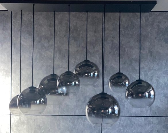 Schitterende hanglamp met 8 glazen bollen in verschillende afmetingen.